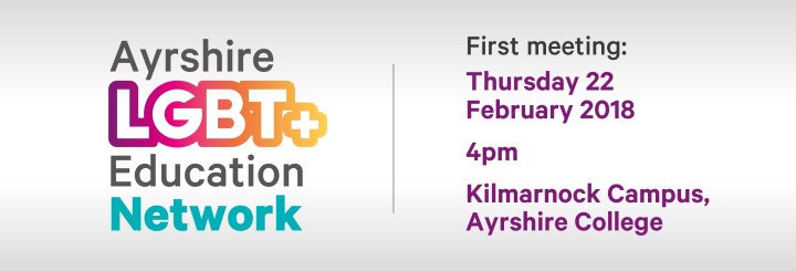 “I am delighted we are progressing with establishing this LGBT+ Education Network for those working in education and related in Ayrshire; it is a real opportunity for us all to come together to share and learn from each other with the aim of improving the educational experiences of LGBT+ children, young people and adults in our local schools, College and any other learning spaces. There are many examples of excellent LGBT+ inclusive practices in Ayrshire and now for the first time, the Network provides the opportunity to share that on a pan-Ayrshire basis. It is an exciting, forward-thinking initiative to be a part of and I hope many people join us at our first meet on Feb 22nd.“
