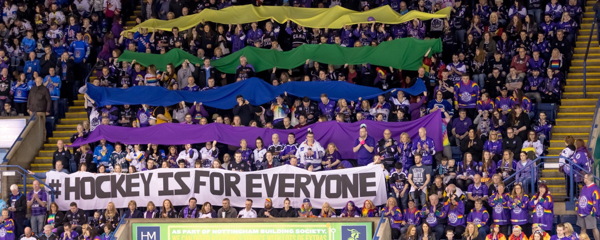 Glasgow’s ice hockey team, based at Braehead, stood firmly behind its supporters who organised the #HockeyIsForEveryone display in Nottingham to demonstrate solidarity with LGBT people and show that ice hockey is a sport that welcomes everyone.