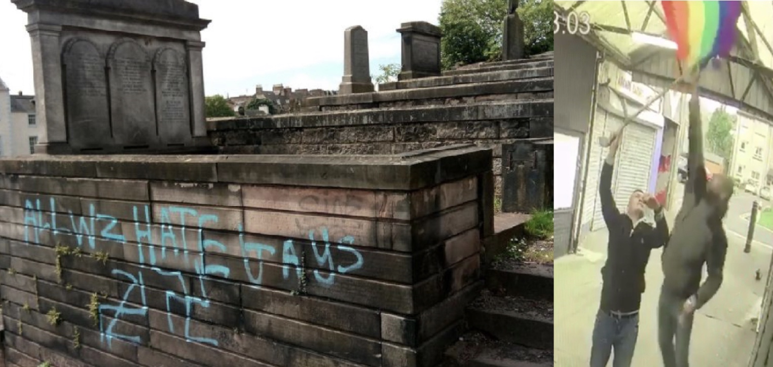 But the vandals didn’t stop there, they have now also targeted the New Calton Burial Ground nearby on Regent Road, with “Allwz Hate Gays” sprayed across graves and walls in the historic cemetery.